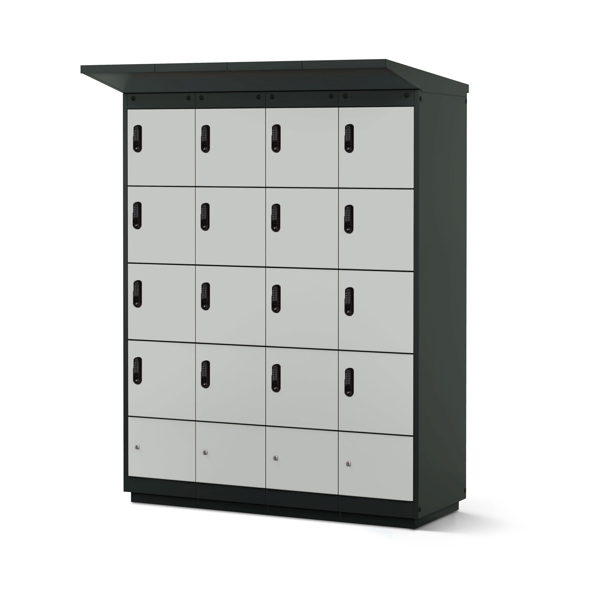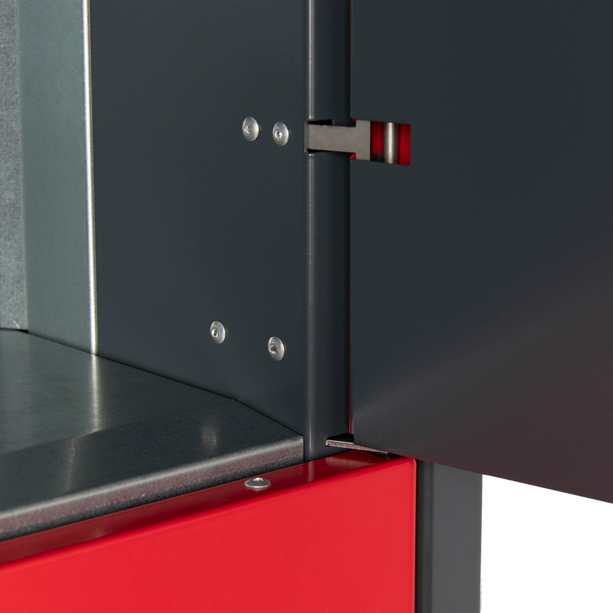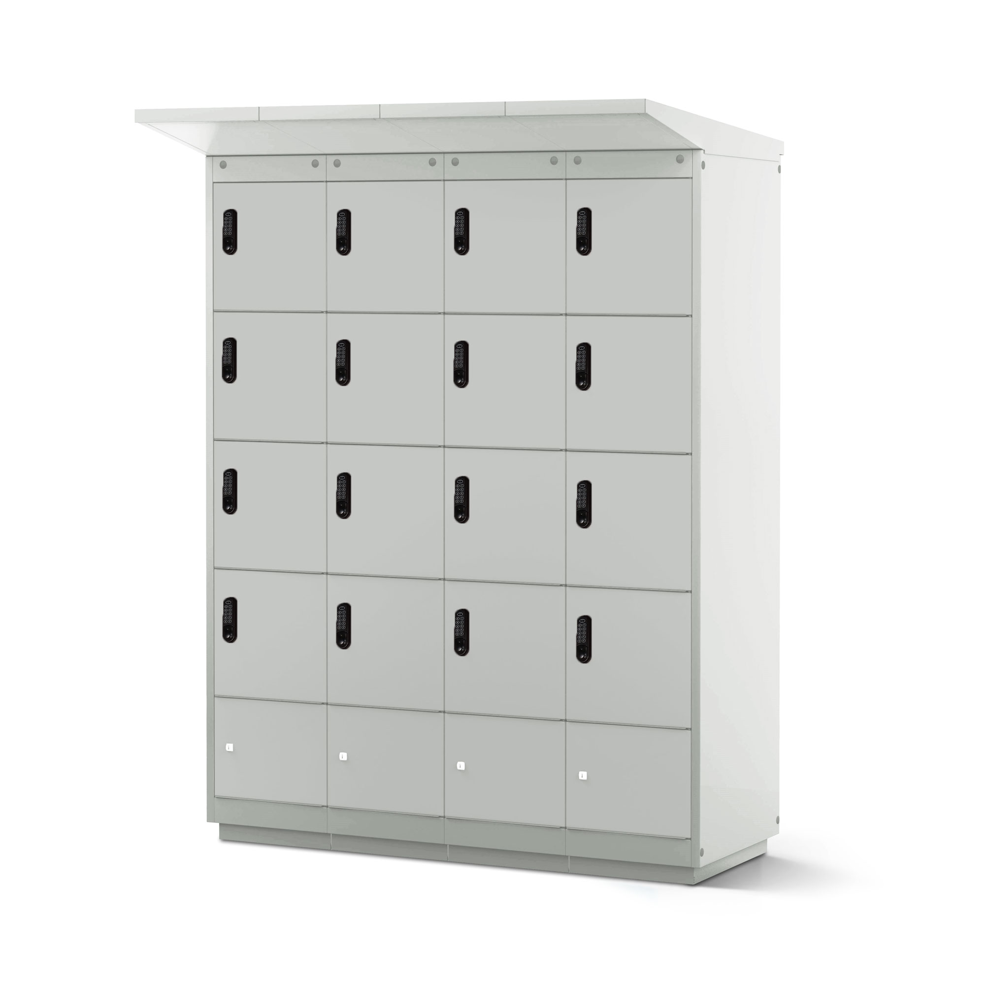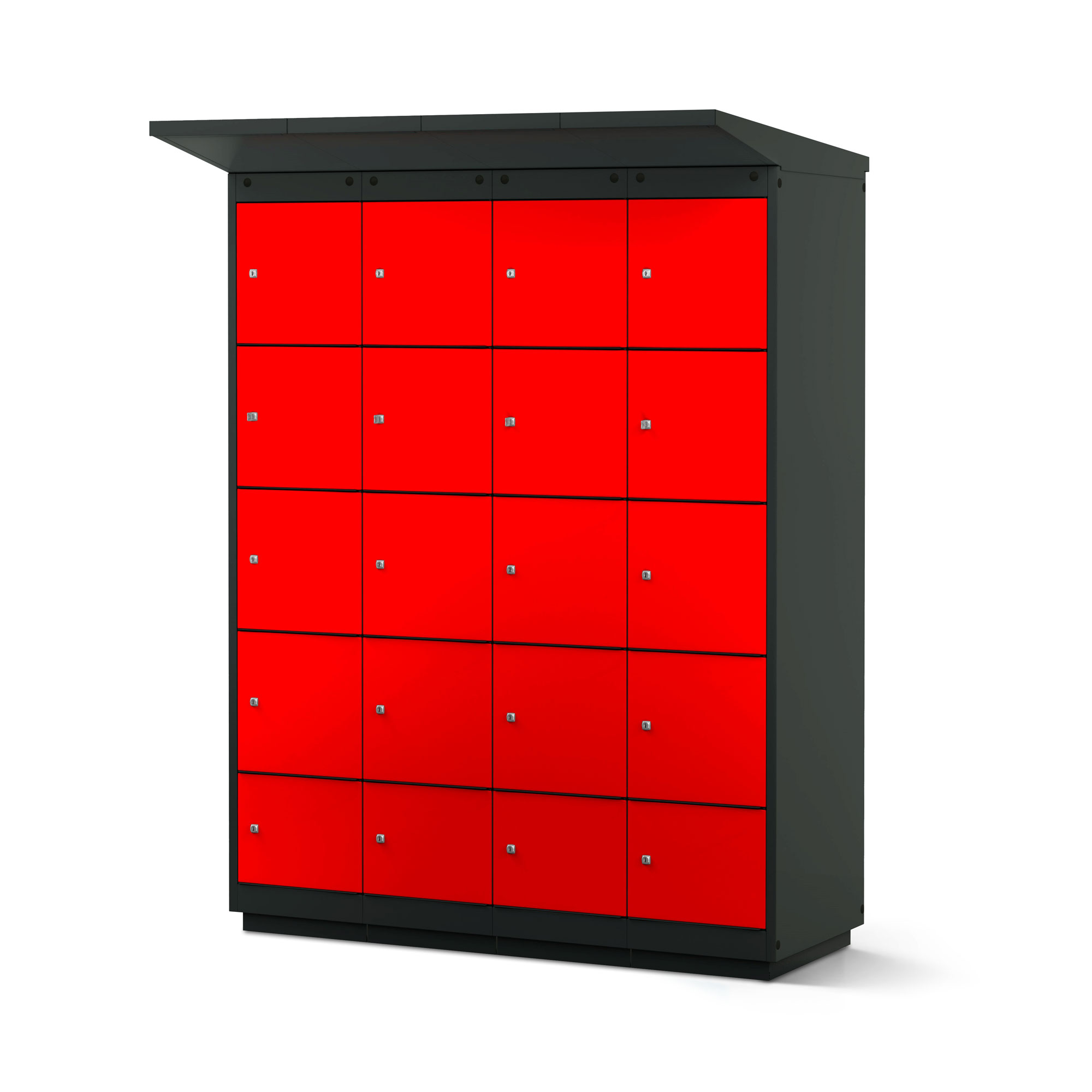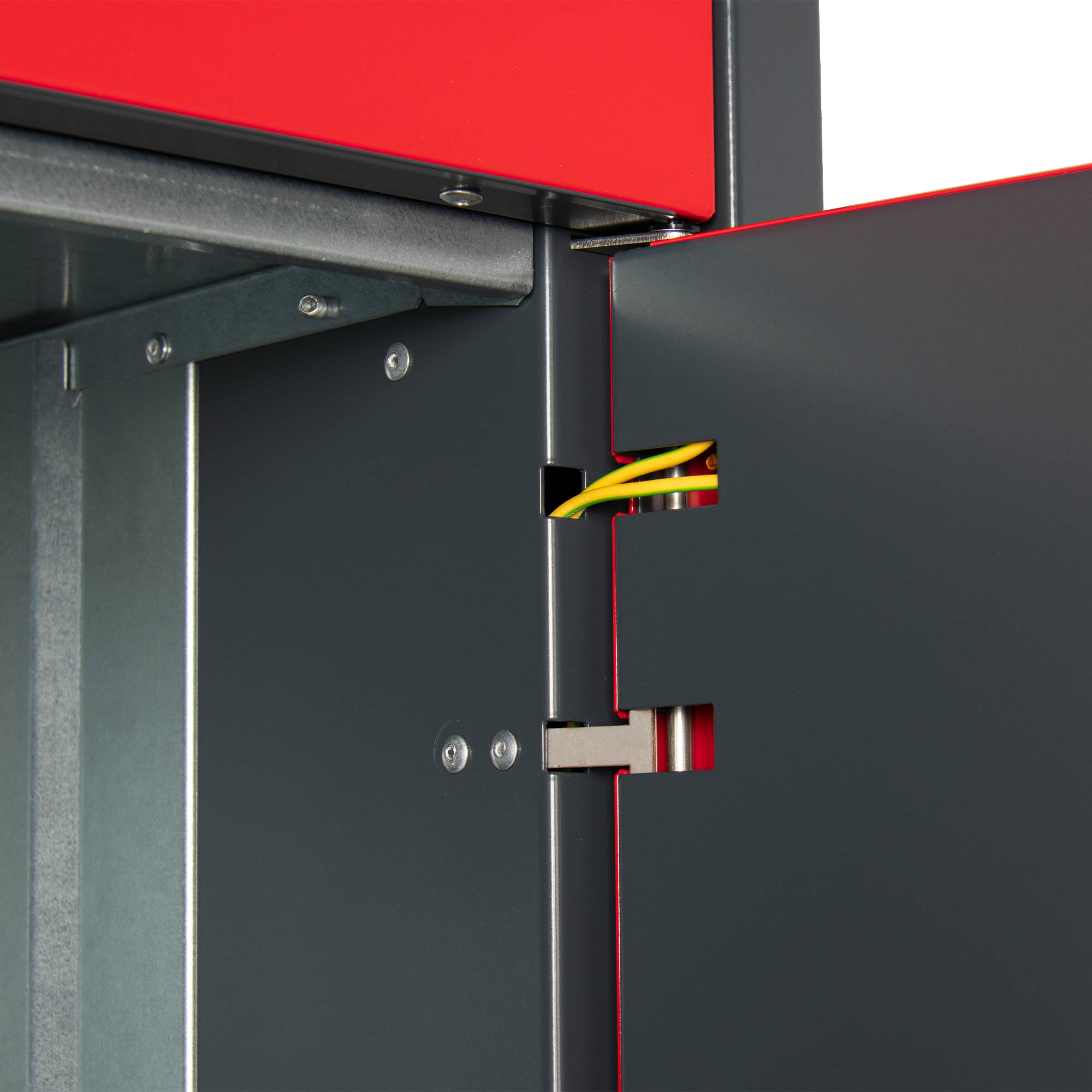Höhe: 210 cm + Sockel hvb. 4,2-9,2 cm, Breite: 166 cm, Tiefe: 63 cm + Dach 40 cm, Fachmass (HxBxT): 36,9 x 34 x 60 cm, Artikelgewicht: 440 kg Elektrifizierung: 2x 230V/ 16A CH-Steckdose pro Fach, Typ 12, passend für Schweizer Stecker, pro Modul à 4 Fächern bauseitige Absicherung mit 16A/230V Verschlüsse: 16x Zylinderschloss mit 2 Schlüsseln, inkl. Hauptschlüssel Korpus: vorbereitet für Verankerung und Installation am Boden, Innenliegende Lüftungslöcher Türen: doppelwandig, staub- und nässegeschützt Servicefach: das unterste 5. Fach dient als Technikfach und ist abschliessbar mit Zylinderschloss