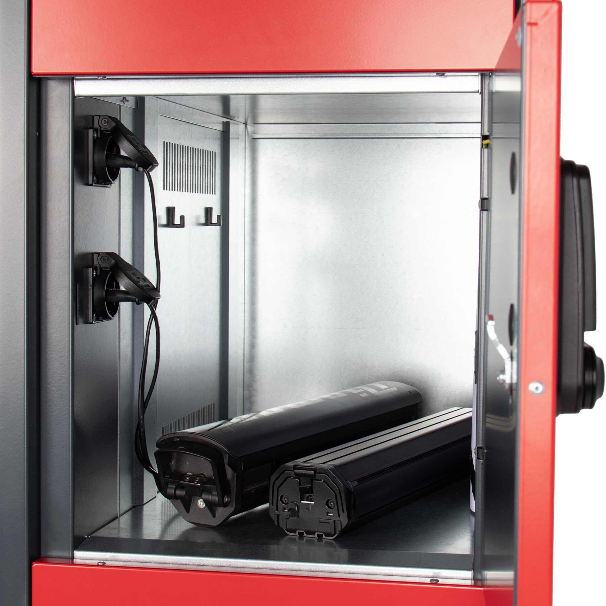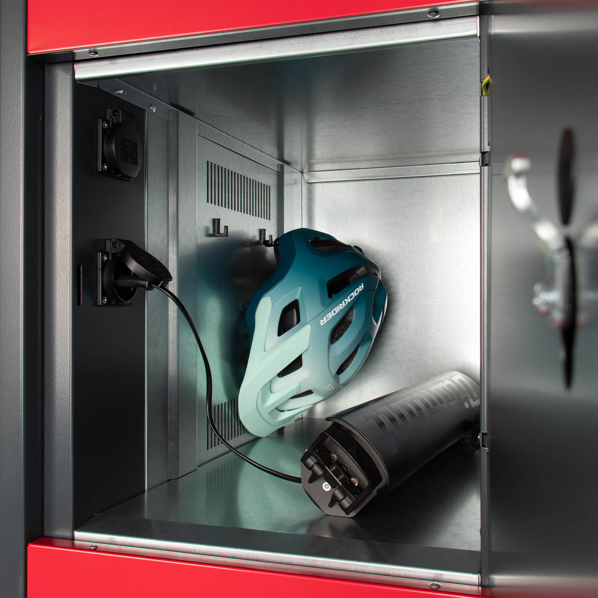Mit der E-Bike Ladestation 16 sind Akkus im Handumdrehen wieder voll. Und nicht nur das: Sie bietet auch Platz für Helm, Rucksack oder anderes Gepäck – sicher verstaut, während du unterwegs bist.